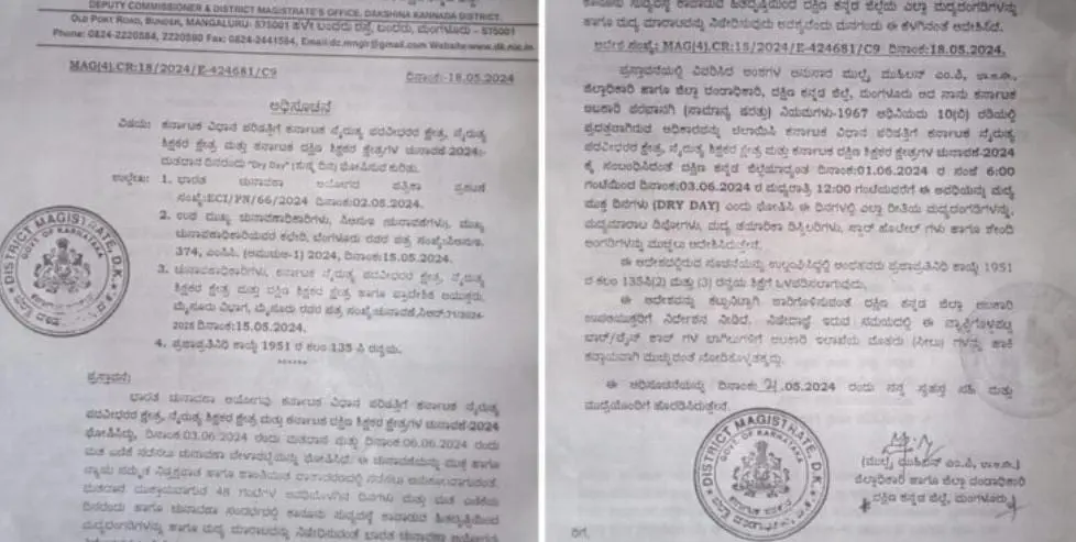 ದಿ.1-06-2024 ರ ಸಂಜೆ 6 ಗಂಟೆಯಿಂದ ದಿನಾಂಕ 03-06-2024 ರ ಮಧ್ಯರಾತ್ರಿ 12 ಗಂಟೆಯವರೆಗೆ ಈ ಅವಧಿಯನ್ನು ಮದ್ಯ ಮುಕ್ತ ದಿನಗಳು ಎಂದು ಘೋಷಿಸಲಾಗಿದೆ. ಈ ಆದೇಶವನ್ನು ಕಟ್ಟುನಿಟ್ಟಾಗಿ ಜಾರಿಗೊಳಿಸುವಂತೆ ದಕ್ಷಿಣ ಕನ್ನಡ ಜಿಲ್ಲಾ ಅಬಕಾರಿ ಉಪಆಯುಕ್ತರಿಗೆ ನಿರ್ದೇಶನ ನೀಡಿದೆ.