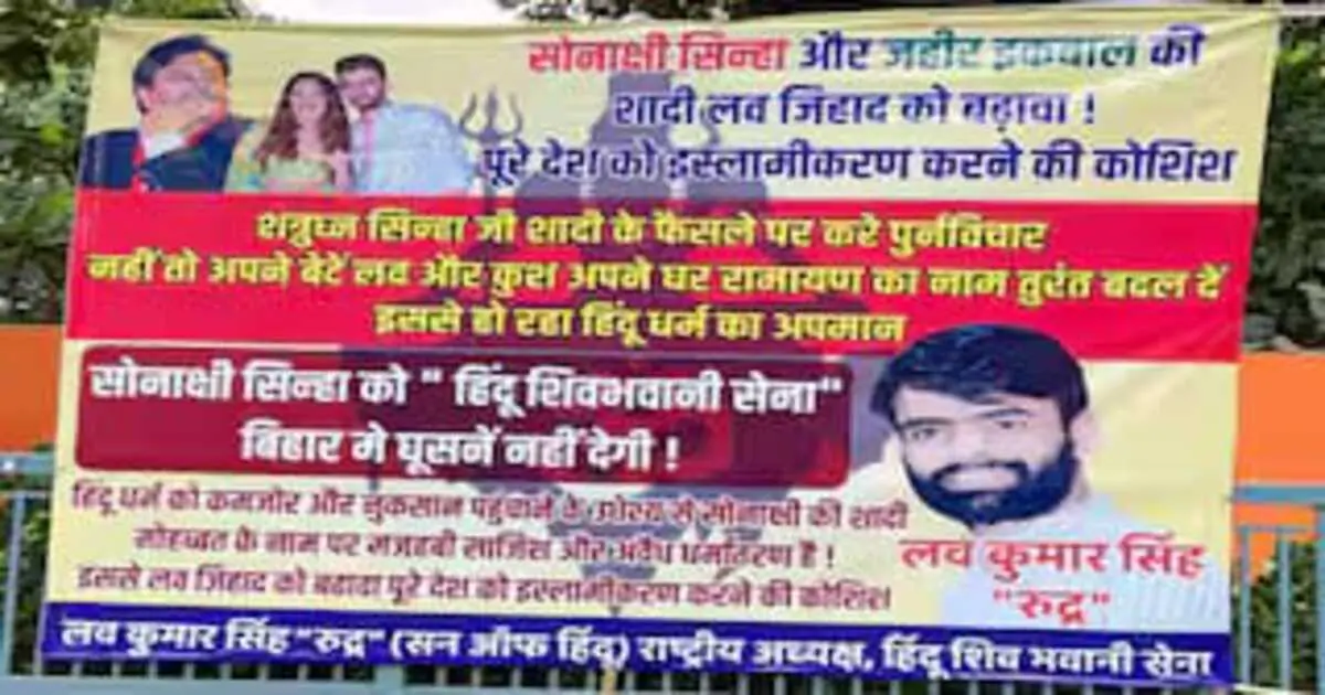 ಸೋನಾಕ್ಷಿ ಸಿನ್ಹಾ ಮತ್ತು ಜಹೀರ್ ಇಕ್ಬಾಲ್ ಅವರ ಮದುವೆ ಲವ್ ಜಿಹಾದ್ ಅನ್ನು ಉತ್ತೇಜಿಸುತ್ತದೆ ಎಂದು ಹಿಂದೂ ಶಿವ ಭವಾನಿ ಸೇನೆ ಪೋಸ್ಟರ್ ಅನ್ನು ಹಾಕಿದೆ. “ಇಡೀ ದೇಶವನ್ನು ಇಸ್ಲಾಮೀಕರಣಗೊಳಿಸುವ ಪ್ರಯತ್ನ, ಶತ್ರುಘ್ನ ಸಿನ್ಹಾ ಜಿ ಮದುವೆಯ ನಿರ್ಧಾರವನ್ನು ಮರುಪರಿಶೀಲಿಸಬೇಕು, ಇಲ್ಲದಿದ್ದರೆ ಅವರ ಮಕ್ಕಳಾದ ಲುವ್ ಮತ್ತು ಕುಶ್ ಅವರ ಮನೆಯ ರಾಮಾಯಣದ ಹೆಸರನ್ನು ತಕ್ಷಣವೇ ಬದಲಾಯಿಸಬೇಕು. ಇದು ಹಿಂದೂ ಧರ್ಮವನ್ನು ಅವಮಾನಿಸುತ್ತದೆ” ಎಂದು ಬರೆಯಲಾಗಿದೆ.