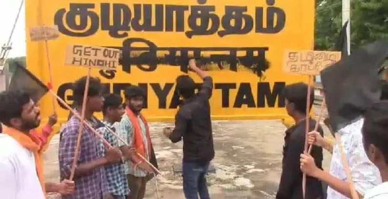Chennai: ಕೇಂದ್ರ ಸರಕಾರ ತಮಿಳುನಾಡಿನಲ್ಲಿ ಹಿಂದಿ ಹೇರಿಕೆ ಮಾಡುತ್ತಿದೆ ಎಂದು ಆಡಳಿತಾರೂಢ ಡಿಎಂಕೆ ಆರೋಪ ಮಾಡುತ್ತಿರುವಂತೆ ತಮಿಳು ಪರ ಕಾರ್ಯಕರ್ತರು ಭಾನುವಾರ ಪೊಲ್ಲಾಚಿ ರೈಲು ನಿಲ್ದಾಣದ ನಾಮಫಲಕದಲ್ಲಿರುವ ಹಿಂದಿ ಅಕ್ಷರಗಳಿಗೆ ಮಸಿ ಬಳಿದಿದ್ದಾರೆ.