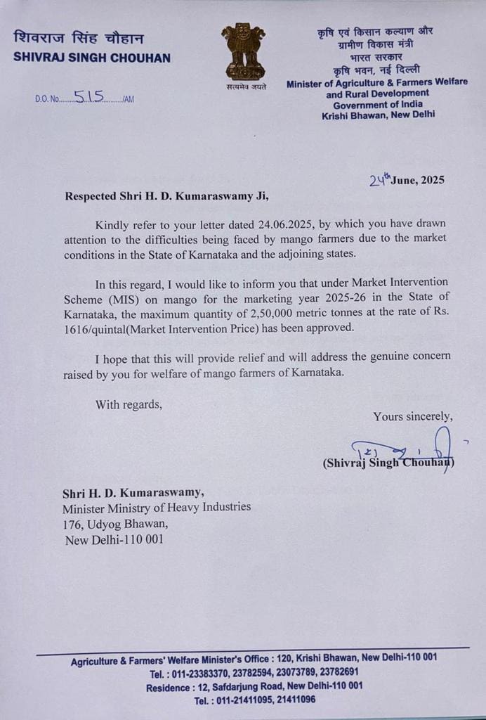“ಬೆಲೆ ಕುಸಿತದಿಂದ ಉಂಟಾದ ತೀವ್ರ ಸಂಕಷ್ಟದ ಹಿನ್ನೆಲೆಯಲ್ಲಿ ನಾನು ವಿನಂತಿಯನ್ನು ಸಲ್ಲಿಸಿದ ತಕ್ಷಣ, ಮಾರುಕಟ್ಟೆ ಮಧ್ಯಸ್ಥಿಕೆ ಯೋಜನೆ (MIS) ಅಡಿಯಲ್ಲಿ ಬೆಂಬಲ ಬೆಲೆಯನ್ನು ತ್ವರಿತವಾಗಿ ಘೋಷಿಸಿದ್ದಕ್ಕಾಗಿ ಕರ್ನಾಟಕದ ಮಾವು ರೈತರ ಪರವಾಗಿ ಕೇಂದ್ರ ಕೃಷಿ ಸಚಿವ ಶ್ರೀ @ChouhanShivraj ಅವರು ಅವರಿಗೆ ನನ್ನ ಕೃತಜ್ಞತೆಯನ್ನು ವ್ಯಕ್ತಪಡಿಸುತ್ತೇನೆ.”