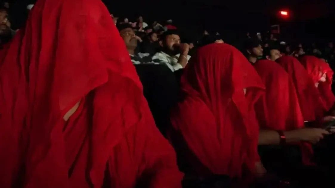 ಹೌದು, ಕೆಂಪು ಬಣ್ಣದ ಪರದೆಗಳನ್ನು ಮುಖಕ್ಕೆ ಹಾಕಿಕೊಂಡು ಒಟ್ಟಿಗೆ ಚಿತ್ರಮಂದಿರಕ್ಕೆ ಬಂದು, ಇಡೀ ಸಿನಿಮಾ ಅನ್ನು ಪರದೆ ಧರಿಸಿಯೇ ಸಿನಿಮಾ ನೋಡಿದ್ದಾರೆ ಮಹಿಳೆಯರು. ಹೀಗೆ ಮಹಿಳೆಯರು ಪರದೆ ಹಾಕಿಕೊಂಡು ಸಿನಿಮಾ ನೋಡಿರುವ ಚಿತ್ರ, ವಿಡಿಯೋ ವೈರಲ್ ಆಗಿದ್ದು, ಮಹಿಳೆಯರು ಹೀಗೇಕೆ ಮಾಡಿದ್ದಾರೆ ಎಂಬ ಚರ್ಚೆ ಪ್ರಾರಂಭವಾಗಿದೆ.