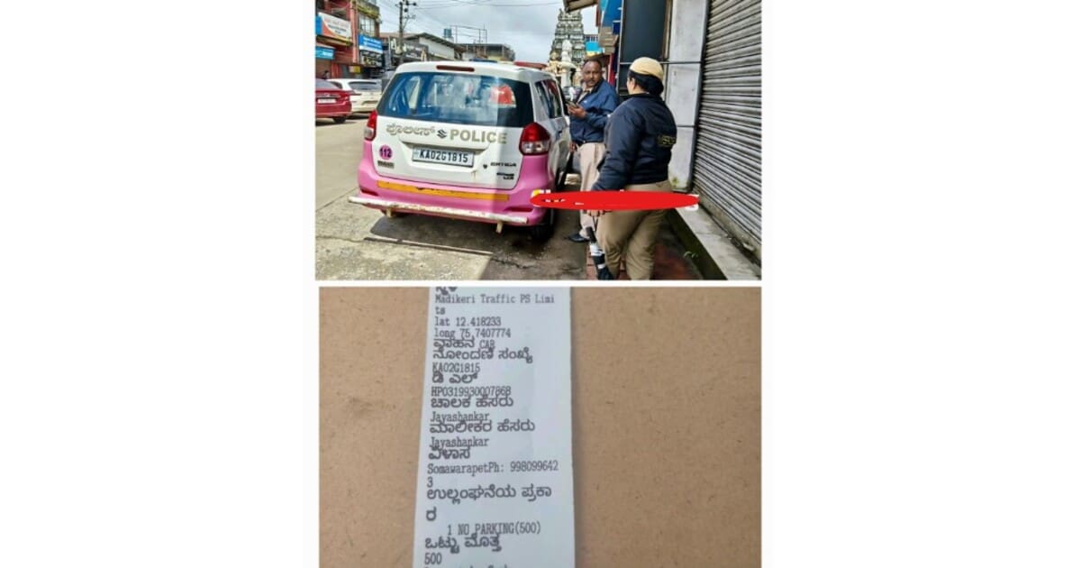 ಮಡಿಕೇರಿ ನಗರದ ಕಾಲೇಜು ರಸ್ತೆಯ ಏಕಮುಖ ರಸ್ತೆಯಲ್ಲಿ ನೋ ಪಾರ್ಕಿಂಗ್ ಸ್ಥಳದಲ್ಲಿ ನಿಂತಿದ್ದ ಮಹಿಳಾ ಸಹಾಯವಾಣಿ (ಪಿಂಕ್ ಗಸ್ತು ವಾಹನ )ಕ್ಕೆ ಮಡಿಕೇರಿ ಸಂಚಾರಿ ಪೊಲೀಸರು ದಂಡ ವಿಧಿಸಿದ್ದಾರೆ. ವಾಹನ ಸಂಖ್ಯೆ KA02 G 1815 ವಾಹನ ಚಾಲಕ ಜಯಶಂಕರ್ ರಿಗೆ 500ರೂ ದಂಡ ವಿಧಿಸಲಾಗಿದೆ.