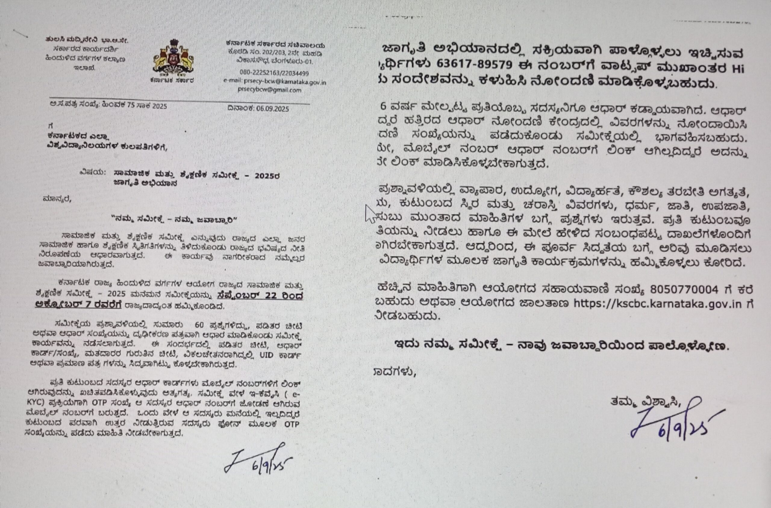 ಕರ್ನಾಟಕ ರಾಜ್ಯ ಹಿಂದುಳಿದ ವರ್ಗಗಳ ಆಯೋಗ ರಾಜ್ಯದ ಸಾಮಾಜಿಕ ಮತ್ತು ಶೈಕ್ಷಣಿಕ ಸಮೀಕ್ಷೆ 2025 ಮನೆಮನೆ ಸಮೀಕ್ಷೆಯನ್ನು ಸೆಪ್ಟೆಂಬರ್ 22 ರಿಂದ ಅಕ್ಟೋಬರ್ 7 ರವರೆಗೆ ರಾಜ್ಯದಾದ್ಯಂತ ಹಮ್ಮಿಕೊಂಡಿದೆ. ಸಮೀಕ್ಷೆಯ ಪ್ರಶ್ನಾವಳಿಯಲ್ಲಿ ಸುಮಾರು 60 ಪ್ರಶ್ನೆಗಳಿದ್ದು, ಪಡಿತರ ಚೀಟಿ ಅಥವಾ ಆಧಾರ್ ಸಂಖ್ಯೆಯನ್ನು ದೃಢೀಕರಣ ಪತ್ರವಾಗಿ ಆಧಾರ ಮಾಡಿಕೊಂಡು ಸಮೀಕ್ಷೆ ಕಾರ್ಯವನ್ನು ನಡೆಸಲಾಗುತ್ತದೆ. ಈ ಸಂದರ್ಭದಲ್ಲಿ ಪಡಿತರ ಚೀಟಿ, ಆಧಾರ್ ಕಾರ್ಡ್/ಸಂಖ್ಯೆ ಮತದಾರರ ಗುರುತಿನ ಚೀಟಿ, ವಿಕಲಚೇತನರಾಗಿದ್ದಲ್ಲಿ UID ಕಾರ್ಡ್ ಅಥವಾ ಪ್ರಮಾಣ ಪತ್ರ ಗಳನ್ನು ಸಿದ್ಧವಾಗಿಟ್ಟು ಕೊಳ್ಳಬೇಕಾಗಿರುತ್ತದೆ.