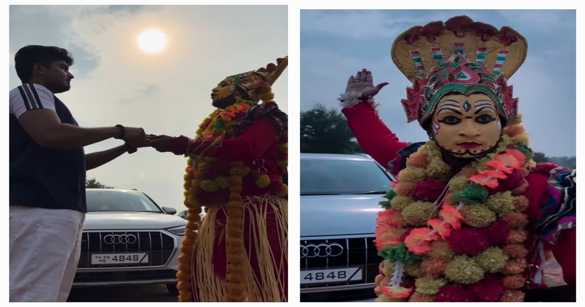 ಹೌದು, ತಮಿಳುನಾಡಿನಲ್ಲಿ ವ್ಯಕ್ತಿ ಒಬ್ಬ ತಾನು ಖರೀದಿಸಿದ ಹೊಸ ಆಡಿ ಕಾರಿನ ಪಬ್ಲಿಸಿಟಿಗಾಗಿ ದೈವವನ್ನು ಬಳಕೆ ಮಾಡಿ ಕೊಂಡಿದ್ದಾನೆ. ಈತ ಮತ್ತೊಬ್ಬ ವ್ಯಕ್ತಿಗೆ ಪಂಜುರ್ಲಿ ದೈವದ ರೀತಿ ವೇಷವನ್ನು ತೊಟ್ಟು, ಹಿನ್ನೆಲೆಯಾಗಿ ಕಾಣ್ತಾರ ಚಿತ್ರದ ಸಂಗೀತವನ್ನು ಬಳಸಿ ಹುಚ್ಚಾಟ ತೋರಿದ್ದಾನೆ. ಈ ಕುರಿತಾದ ವಿಡಿಯೋ ಸೋಶಿಯಲ್ ಮೀಡಿಯಾದಲ್ಲಿ ವೈರಲ್ ಆಗಿದೆ. ಇದರಲ್ಲಿ ದೈವದ ವೇಷ ತೊಟ್ಟವನ್ನು ಅರಚುತ್ತ, ಕಿರುಚುತ್ತಾ, ಕೂಗುತ್ತಾ ಕಾರಿನ ಸುತ್ತ ಬೇಕಾಬಿಟ್ಟಿ ಕುಣಿದಾಡುತ್ತಿರುವುದನ್ನು ಕಾಣಬಹುದು. ನಂತರ ಕಾರಿನ ಡಾಕ್ಯುಮೆಂಟ್ಗಳನ್ನು ದೈವವೇ ಕಾರಿನ ಓನರ್ ಗೆ ನೀಡಿ ಹರಸುವುದನ್ನು ಕೂಡ ಇದರಲ್ಲಿ ಕಾಣಬಹುದು.