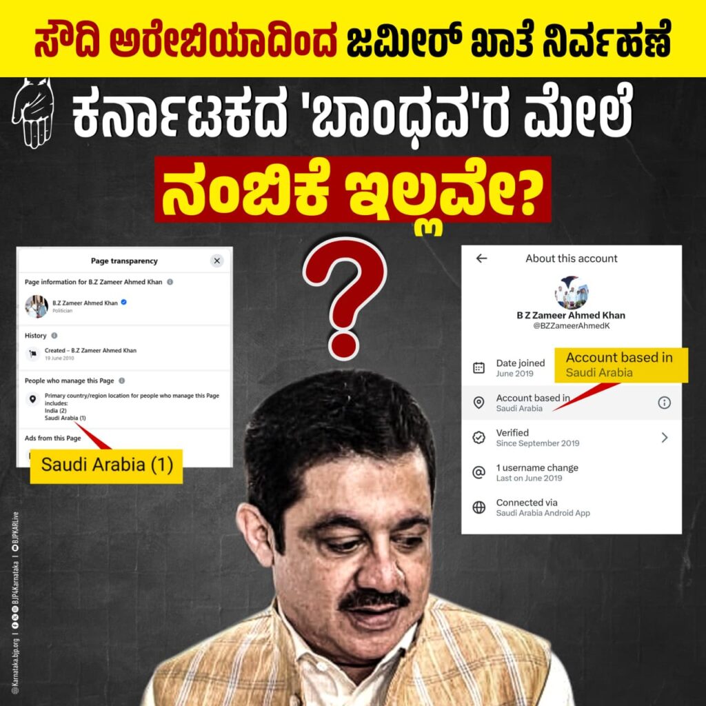 ಜಮೀರ್ ಅವರ ಸಾಮಾಜಿಕ ಜಾಲತಾಣಗಳು ಸೌದಿಯಿಂದ ನಿರ್ವಹಣೆಯಾಗುತ್ತಿರುವುದು ಲೋಕಸತ್ಯ, ಜಮೀರ್ ನಿರ್ವಹಿಸುವ ಸಚಿವಾಲಯವನ್ನು ನಿಯಂತ್ರಿಸುವುದು ಟರ್ಕಿಯೋ, ಪ್ಯಾಲೇಸ್ತೀನೋ? ಜಮೀರ್ ಅವರೇ, ಕರ್ನಾಟಕದ ನಿಮ್ಮದೇ ‘ಬಾಂಧವʼರ ಮೇಲೆ ನಿಮಗೆ ನಂಬಿಕೆ ಇಲ್ಲವೇ ?