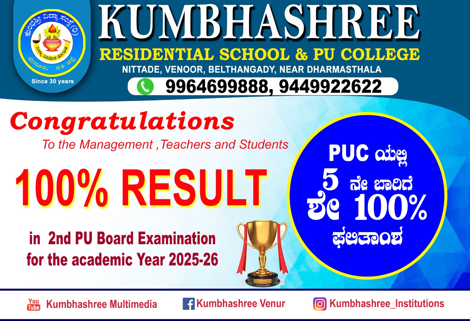ಕುಂಭಶ್ರೀ ವಿದ್ಯಾ ಸಂಸ್ಥೆ (ರಿ) ವೇಣೂರು, ದ.ಕ ಜಿಲ್ಲೆ ಇಲ್ಲಿ ದ್ವಿತೀಯ ಪಿಯುಸಿ ಫಲಿತಾಂಶದಲ್ಲಿ 100% ಫಲಿತಾಂಶ ಬಂದಿದೆ.
