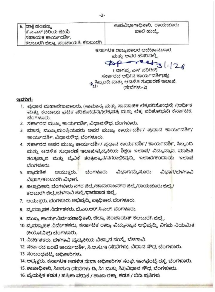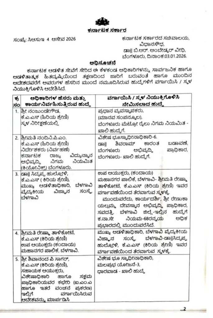 ಕರ್ನಾಟಕ ಆಡಳಿತ ಸೇವೆಗೆ ಸೇರಿದ ಈ ಕೆಳಕಂಡ ಅಧಿಕಾರಿಗಳನ್ನು ಸಾರ್ವಜನಿಕ ಹಾಗೂ ಆಡಳಿತಾತ್ಮಕ ಹಿತದೃಷ್ಠಿಯಿಂದ ತಕ್ಷಣದಿಂದ ಜಾರಿಗೆ ಬರುವಂತೆ ಹಾಗೂ ಮುಂದಿನ ಆದೇಶದವರೆಗೆ ಅವರುಗಳ ಹೆಸರಿನ ಮುಂದೆ ನಮೂದಿಸಿರುವ ಹುದ್ದೆಗಳಿಗೆ ವರ್ಗಾಯಿಸಿ / ಸ್ಥಳ ನಿಯುಕ್ತಿಗೊಳಿಸಿ ಆದೇಶಿಸಿದೆ.