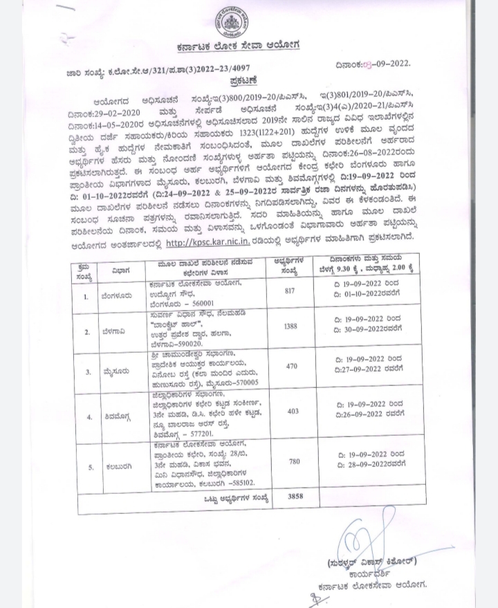 ದಾಖಲೆಗಳ ಪರಿಶೀಲನೆ ನಡೆಯುವ ದಿನಾಂಕ : 19-09 2022 ರಿಂದ 01-10-2022 ರವರೆಗೆ (ಸಾರ್ವತ್ರಿಕ ರಜಾ ದಿನ ಹೊರತುಪಡಿಸಿ). ಅಭ್ಯರ್ಥಿಗಳಿಗೆ ದಾಖಲೆಗಳ ಪರಿಶೀಲನಾ ಸೂಚನಾ ಪತ್ರಗಳನ್ನು ಕೆಪಿಎಸ್ಸಿ ಈಗಾಗಲೇ ರವಾನಿಸುವ ಕೆಲಸ ಆರಂಭಿಸಿದೆ.
