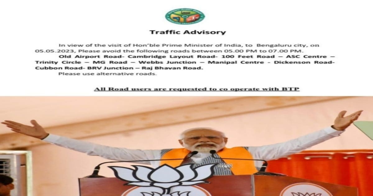 PM Narendra Modi: ಕರ್ನಾಟಕದಲ್ಲಿ ವಿಧಾನಸಭೆ ಚುನಾವಣೆಯ (Karnataka Assembly Elections 2023) ಬಿಸಿ ಏರಿದೆ. ಕಾಂಗ್ರೆಸ್‌, ಬಿಜೆಪಿ, ಆಪ್‌, ಜೆಡಿಎಸ್‌ ಪಕ್ಷಗಳು ತಮ್ಮ ತಮ್ಮ ಅಭ್ಯರ್ಥಿಗಳು ಗೆಲುವು ಸಾಧಿಸಲೇ ಬೇಕೆಂಬ ಹಂಬಲದಿಂದ ಸತತ ಪ್ರಚಾರ ಕಾರ್ಯಕ್ರಮದಲ್ಲಿ ತೊಡಗಿದ್ದಾರೆ. ಅದೇ ರೀತಿ ರಾಜಕೀಯ ಧುರೀಣರು ಕೂಡಾ ಅಬ್ಬರದ ಪ್ರಚಾರ ಕಾರ್ಯಕ್ರಮದಲ್ಲಿ ನಿರತರಾಗಿದ್ದಾರೆ. ಹಾಗೆನೇ ಪ್ರಧಾನಿ ನರೇಂದ್ರ ಮೋದಿ (PM Narendra Modi) ಎಪ್ರಿಲ್‌ 29 ರಿಂದ ಪ್ರಚಾರ ಕಾರ್ಯಕ್ರಮದಲ್ಲಿ ತೊಡಗಿಕೊಂಡಿದ್ದಾರೆ. ಇಂದು ಮೇ. 05 ರಂದು ಮತ್ತೆ ತಮ್ಮ ಪ್ರಚಾರ ಕಾರ್ಯಕ್ರಮದಲ್ಲಿ ತೊಡಗಿಕೊಳ್ಳಲಿರುವುದರಿಂದ, ಇಂದು ಸಂಜೆ ಮೋದಿ ಅವರು ಬೆಂಗಳೂರಿಗೆ (Bangalore) ಗೆ ಬರಲಿದ್ದಾರೆ. ಈ ಕಾರಣದಿಂದ ಕೆಲ ರಸ್ತೆಗಳಲ್ಲಿ ವಾಹನ ಸಂಚಾರ ಬದಲಾವಣೆಯಾಗಲಿದೆ.