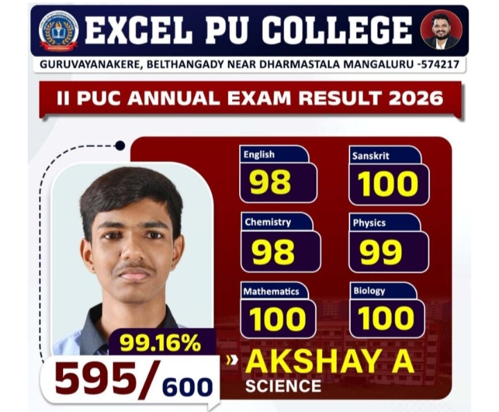 ಗುರುವಾಯನಕೆರೆ: ದ್ವಿತೀಯ ಪಿಯುಸಿ ಫಲಿತಾಂಶದಲ್ಲಿ ಎಕ್ಸೆಲ್ ಕಾಲೇಜಿನ ವಿಜ್ಞಾನ ವಿಭಾಗ ಶೇಕಡಾ 100 ಫಲಿತಾಂಶ ದಾಖಲಿಸಿದೆ.
