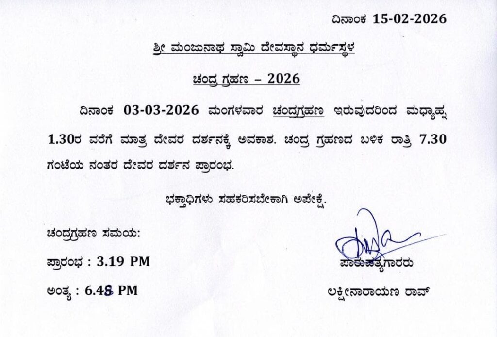 ಧರ್ಮಸ್ಥಳ: ಮುಂಬರುವ ಚಂದ್ರಗ್ರಹಣದ ಕಾರಣ ಮಾರ್ಚ್ 3,2026 ರಂದು ಶ್ರೀ ಕ್ಷೇತ್ರ ಧರ್ಮಸ್ಥಳದ ಶ್ರೀ ಮಂಜುನಾಥ ಸ್ವಾಮಿ ದೇವಸ್ಥಾನದ ದರ್ಶನ ಸಮಯದಲ್ಲಿ ಬದಲಾವಣೆ ಮಾಡಿರುವುದಾಗಿ ದೇವಸ್ಥಾನದ ಆಡಳಿತ ಮಂಡಳಿ ಪ್ರಕಟ ಮಾಡಿದೆ.