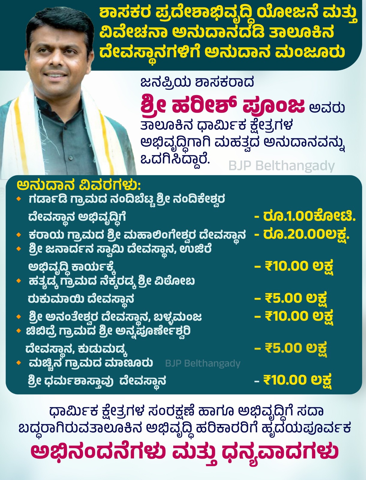 ಜನಪ್ರಿಯ ಶಾಸಕರಾದ ಶ್ರೀ ಹರೀಶ್ ಪೂಂಜ ಅವರು ತಾಲೂಕಿನ ಧಾರ್ಮಿಕ ಕ್ಷೇತ್ರಗಳ ಅಭಿವೃದ್ಧಿಗಾಗಿ ಮಹತ್ವದ ಅನುದಾನವನ್ನು ಒದಗಿಸಿದ್ದಾರೆ.