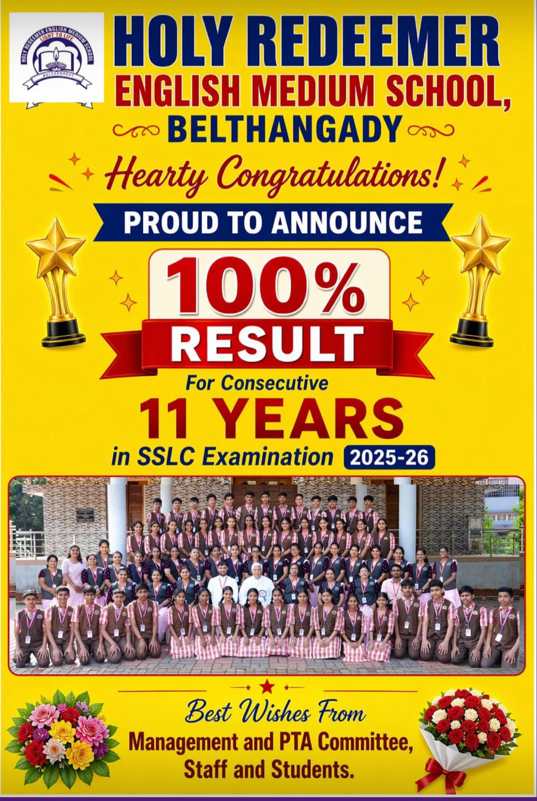 ಹೋಲಿ ರಿಡೀಮರ್ ಇಂಗ್ಲೀಷ್ ಮೀಡಿಯಂ ಸ್ಕೂಲ್ ಬೆಳ್ತಂಗಡಿ ಇಲ್ಲಿ 2025-26ನೇ ಸಾಲಿನ ಎಸ್ ಎಸ್ ಎಲ್ ಸಿ ಪರೀಕ್ಷೆಯಲ್ಲಿ 100% ಫಲಿತಾಂಶ ಬಂದಿದೆ. ಸತತ 11 ನೇ ಬಾರಿ 100% ಫಲಿತಾಂಶ ಲಭಿಸಿದೆ.