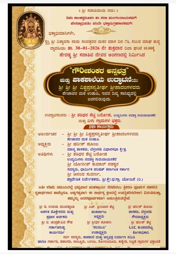 ಪೇರಡ್ಕ ಶ್ರೀ ಸದಾಶಿವ ದೇವರ ಅಂಗಣದಲ್ಲಿ ನಿರ್ಮಾಣಗೊಂಡಿರುವ “ಗೌರೀಶಂಕರ ಅನ್ನಛತ್ರ” ಮತ್ತು ಪಾಕಾಲೆಯ ಉದ್ಘಾಟನೆಯು ಇಂದು ಶ್ರೀ ಶ್ರೀ ಶ್ರೀ ವಿಶ್ವಪ್ರಸನ್ನತೀರ್ಥ ಪಾದಂಗಳವರು, ಪೇಜಾವರ ಮಠ ಉಡುಪಿ, ಇವರ ದಿವ್ಯ ಸಾನಿಧ್ಯದಲ್ಲಿ ಇಂದು ಬೆಳಗ್ಗೆ 10 ಗಂಟೆಗೆ ಜರುಗಿದೆ.