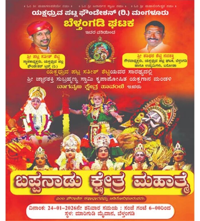 ಬೆಳ್ತಂಗಡಿ: ಯಕ್ಷಧ್ರುವ ಫೌಂಡೇಶನ್ ಮಂಗಳೂರು ಬೆಳ್ತಂಗಡಿ ಘಟಕ ಇದರ ವತಿಯಿಂದ ಯಕ್ಷಧ್ರುವ ಪಟ್ಲ ಸತೀಶ್ ಶೆಟ್ಟಿಯವರ ಸಾರಥ್ಯದಲ್ಲಿ ಶ್ರೀ ಜ್ಞಾನಶಕ್ತಿ ಸ್ವಾಮಿ ಕೃಪಾಪೋಷಿತ ಯಕ್ಷಗಾನ ಮಂಡಳಿ ನಾಗಜ ಕ್ಷೇತ್ರ ಪಾವಂಜೆ ಇವರು ಜ.24 ರಂದು ಬೆಳ್ತಂಗಡಿ ಮಾರಿಗುಡಿ ಮೈದಾನದಲ್ಲಿ “ಬಪ್ಪನಾಡು ಕ್ಷೇತ್ರ ಮಹಾತ್ಮೆ” ಎಂಬ ಪೌರಾಣಿಕ ಕಥಾಭಾಗವನ್ನು ಆಡಿತೋರಿಸಲಿರುವರು ಎಂದು ಯಕ್ಷಧ್ರುವ ಪಟ್ಲ ಬೆಳ್ತಂಗಡಿ ಘಟಕದ ಪದಾಧಿಕಾರಿಗಳು ತಿಳಿಸಿದ್ದಾರೆ.