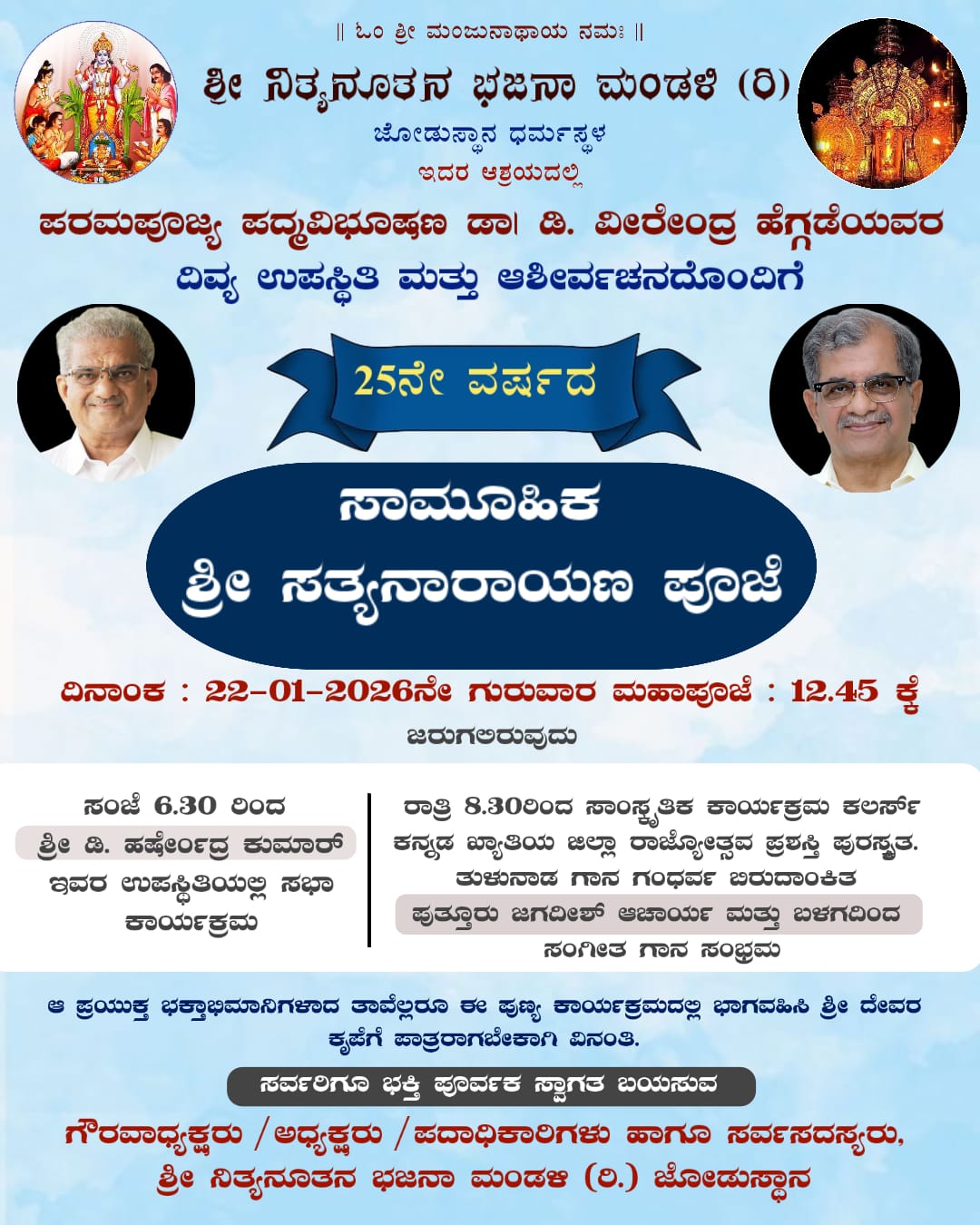 ದಿನಾಂಕ 22.01.2026 ನೇ ಗುರುವಾರದಂದು ಶ್ರೀ ನಿತ್ಯನೂತನ ಭಜನ ಮಂದಿರ (ರಿ) ಜೋಡುಸ್ಥಾನದಲ್ಲಿ 25 ನೇ ವರ್ಷದ ಸಾಮೂಹಿಕ ಸತ್ಯನಾರಾಯಣ ಪೂಜೆಯು ಪೂಜ್ಯ ಖಾವಂದರ ದಿವ್ಯ ಉಪಸ್ಥಿತಿಯಲ್ಲಿ ಮಧ್ಯಾಹ್ನ 12.45 ಕ್ಕೆ ಸರಿಯಾಗಿ ಜರುಗಲಿರುವುದು.
