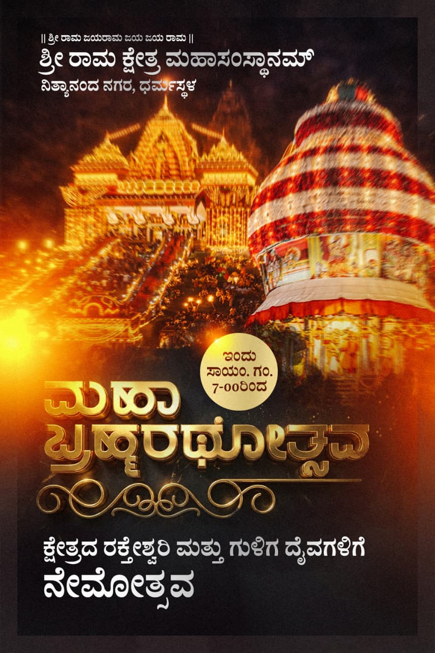 ಶ್ರೀ ರಾಮ ಕ್ಷೇತ್ರ ಮಹಾಸಂಸ್ಥಾನಮ್ ನಿತ್ಯಾನಂದನಗರ, ಧರ್ಮಸ್ಥಳ ಕ್ಷೇತ್ರದ ಮಹಾ ಬ್ರಹ್ಮರಥೋತ್ಸವ ಮತ್ತು ಕ್ಷೇತ್ರದ ರಕ್ತೇಶ್ವರಿ ಮತ್ತು ಗುಳಿಗ ದೈವಗಳ ನೇಮೋತ್ಸವ ವು ಇಂದು ಸಾಯಂ.ಗಂ 7 ರಿಂದ ಪ್ರಾರಂಭವಾಗಲಿದೆ.