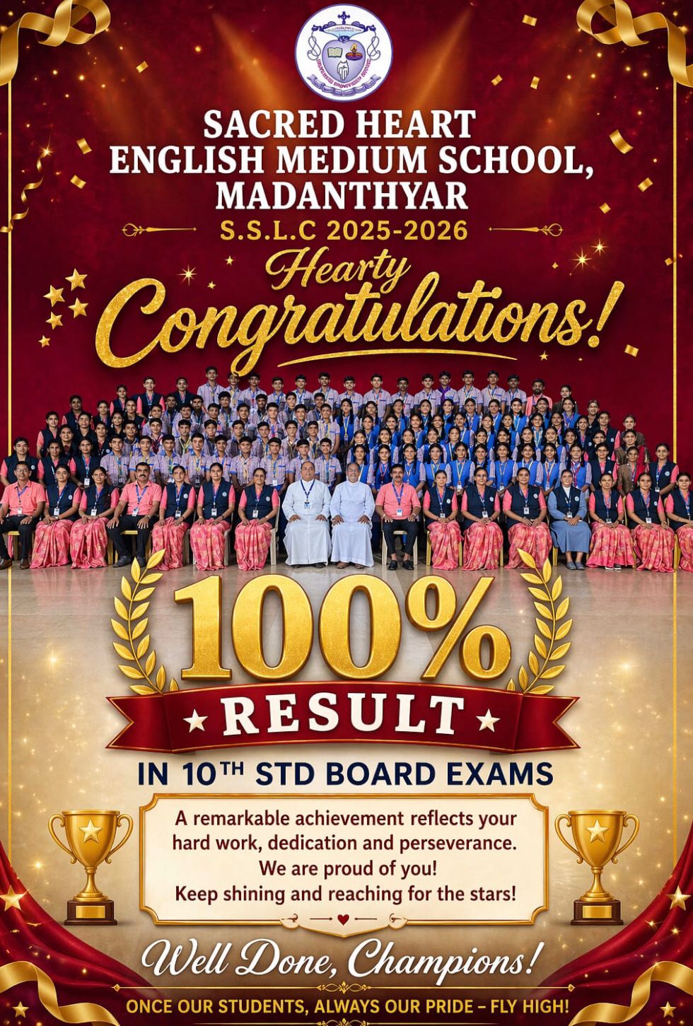 ಸೇಕ್ರೆಡ್ ಹಾರ್ಟ್ ಇಂಗ್ಲೀಷ್ ಮೀಡಿಯಂ ಸ್ಕೂಲ್, ಮಡಂತ್ಯಾರ್ ಇಲ್ಲಿನ ಈ ಬಾರಿಯ 2025-26 ನೇ ಸಾಲಿನ ಎಸ್ ಎಸ್ ಎಲ್ ಸಿ ಪರೀಕ್ಷೆಯಲ್ಲಿ ಶೇ. 100 ರಷ್ಟು ಫಲಿತಾಂಶ ಬಂದಿದೆ.