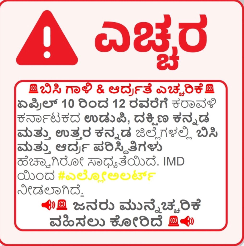 ಎಪ್ರಿಲ್‌ 10 ರಿಂದ 12 ರವರೆಗೆ ದಕ್ಷಿಣ ಕನ್ನಡ, ಉಡುಪಿ ಮತ್ತು ಉತ್ತರ ಕನ್ನಡ ಜಿಲ್ಲೆಗಳಲ್ಲಿ ತಾಪಮಾನವು ಸಾಮಾನ್ಯಕ್ಕಿಂತ ಹೆಚ್ಚಾಗುವ ಸಾಧ್ಯತೆಯಿದೆ ಎಂದು ಹವಾಮಾನ ಇಲಾಖೆ ಮುನ್ಸೂಚನೆ ನೀಡಿದೆ. ಈ ಅವಧಿಯಲ್ಲಿ ಬಿಸಿ ಗಾಳಿಯ ಜೊತೆಗೆ ಹವಾಮಾನದಲ್ಲಿ ತೇವಾಂಶವು ಹೆಚ್ಚಾಗಿರುವುದರಿಂದ ಸಾರ್ವಜನಿಕರು ಹೆಚ್ಚಿನ ಅಸ್ವಸ್ಥತೆಯನ್ನು ಅನುಭವಿಸಬಹುದು.