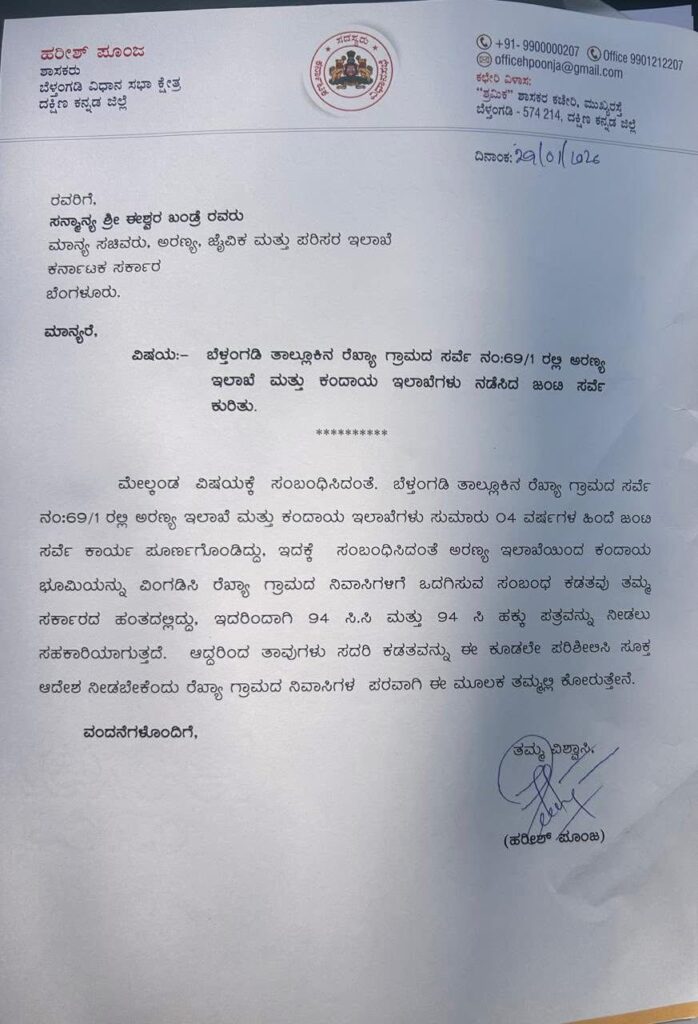 ಬೆಳ್ತಂಗಡಿ: ರೆಖ್ಯ ಗ್ರಾಮದ ಸರ್ವೆ ನಂಬರ್ 69/1ರಲ್ಲಿ ಅರಣ್ಯ ಇಲಾಖೆ ಮತ್ತು ಕಂದಾಯ ಇಲಾಖೆಗಳು ಸುಮಾರು ನಾಲ್ಕು ವರ್ಷಗಳ ಹಿಂದೆ ನಡೆಸಿದ ಜಂಟಿ ಸರ್ವೆ ಕಾರ್ಯ ಪೂರ್ಣಗೊಂಡಿದ್ದು ಇದಕ್ಕೆ ಸಂಬಂಧಿಸಿದಂತೆ ಅರಣ್ಯ ಇಲಾಖೆಯಿಂದ ಕಂದಾಯ ಭೂಮಿಯನ್ನು ಬೇರ್ಪಡಿಸಿ ರೆಖ್ಯ ಗ್ರಾಮದ ನಿವಾಸಿಗಳಿಗೆ ಒದಗಿಸುವಂತೆ ಶಾಸಕ ಹರೀಶ್ ಪೂಂಜರವರು ಅರಣ್ಯ, ಜೈವಿಕ ಮತ್ತು ಪರಿಸರ ಇಲಾಖೆ ಸಚಿವ ಈಶ್ವರ ಖಂಡ್ರೆರವರಿಗೆ ಮನವಿ ಸಲ್ಲಿಸಿದ್ದರು.