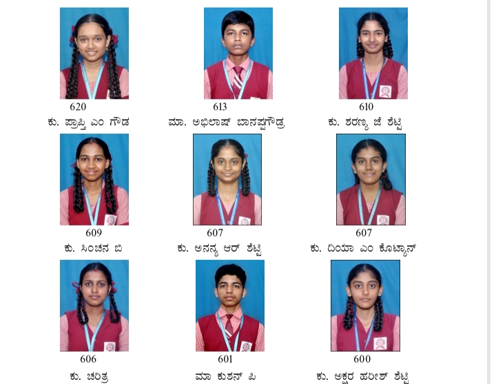 ಕು. ಪ್ರಾಪ್ತಿ ಎಂ ಗೌಡ 620 ಅಂಕದೊಂದಿಗೆ ಶಾಲೆಗೆ ಪ್ರಥಮ ಸ್ಥಾನ ಮತ್ತು ರಾಜ್ಯ ಮಟ್ಟಕ್ಕೆ 6ನೇ ಸ್ಥಾನ, ಮಾ. ಅಭಿಲಾಷ್ ಬಾನಪ್ಪಗೌಡ್ರ 613 ಅಂಕಗಳೊಂದಿಗೆ ಶಾಲೆಗೆ ದ್ವಿತೀಯ ಮತ್ತು ಕು. ಶರಣ್ಯ ಜೆ ಶೆಟ್ಟಿ 610 ಅಂಕಗಳೊಂದಿಗೆ ಶಾಲೆಗೆ ತೃತೀಯ ಸ್ಥಾನ ಪಡೆದಿರುತ್ತಾರೆ. ಕು. ಸಿಂಚನ ಬಿ 609 ಅಂಕ, ಕು. ಅನನ್ಯ ಆರ್ ಶೆಟ್ಟಿ 607 ಅಂಕ, ಕು. ದಿಯಾ ಎಂ ಕೋಟ್ಯಾನ್ 607 ಅಂಕ, ಕು. ಚರಿತ್ರ 606 , ಮಾ.ಕುಶನ್ ಪಿ 601 ಅಂಕ, ಕು. ಅಕ್ಷರ ಹರೀಶ್ ಶೆಟ್ಟಿ 600 ಅಂಕಗಳನ್ನು ಪಡೆದಿರುತ್ತಾರೆ.
