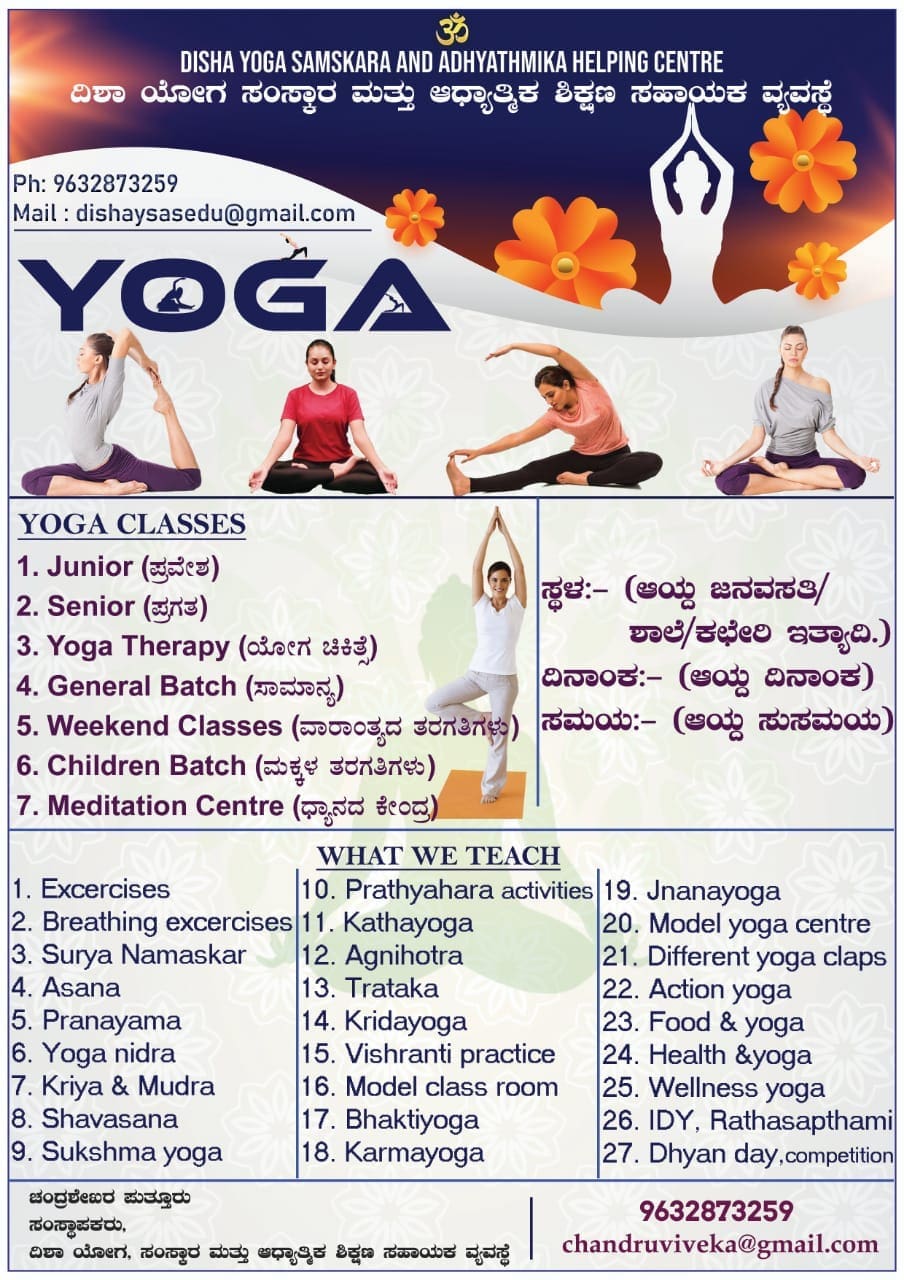 ಪುತ್ತೂರು : ” ಯೋಗ ಜೀವನ ” ಎಲ್ಲ ಶಿಕ್ಷಕರಿಗೆ/ ಸಿಬ್ಬಂದಿಗಳಿಗೆ ಯೋಗ ಶಿಕ್ಷಣ (ಒಂದುದಿನ/ಅರ್ಧದಿನ/ಗಂಟೆಗಳ) ಕಾರ್ಯಾಗಾರ ಲಭ್ಯವಿದೆ.