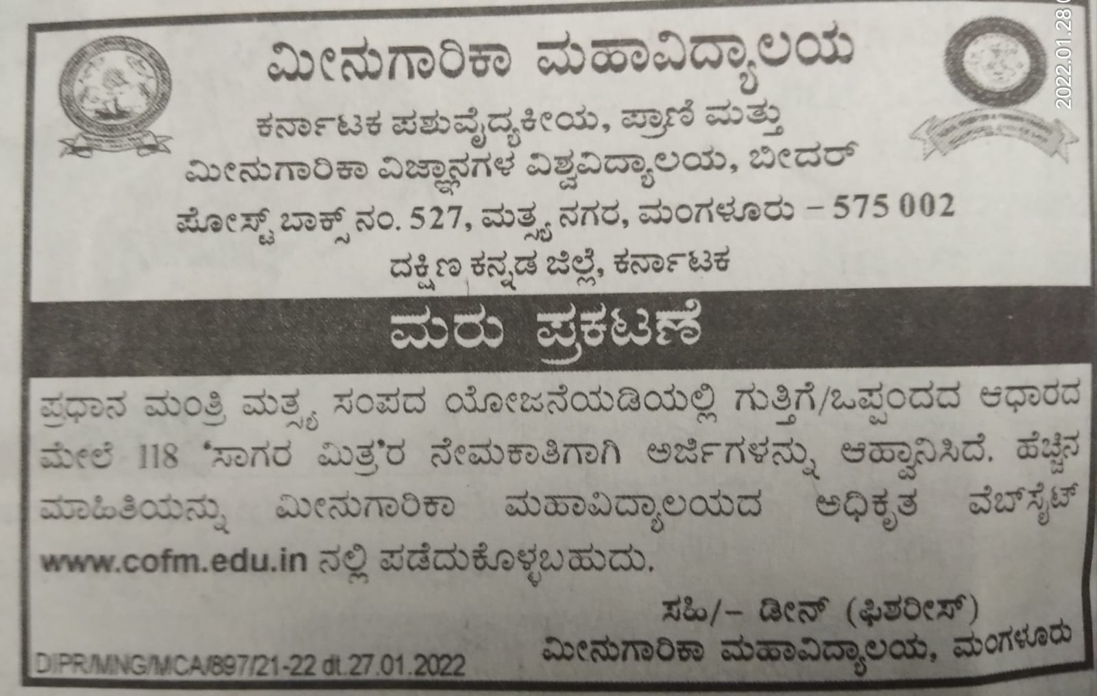 ಪ್ರಧಾನಮಂತ್ರಿ ಮತ್ಸ್ಯ ಸಂಪದ ಯೋಜನೆಯಡಿಯಲ್ಲಿ ಗುತ್ತಿಗೆ / ಒಪ್ಪಂದದ ಆಧಾರದ ಮೇಲೆ 118 ‘ ಸಾಗರ ಮಿತ್ರ’ ರ ನೇಮಕಾತಿಗಾಗಿ ಅರ್ಜಿಗಳನ್ನು ಆಹ್ವಾನಿಸಿದೆ.