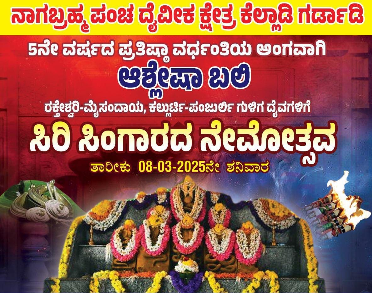 ಆಶ್ಲೇಷಾ ಬಲಿ ರಕೇಶ್ವರಿ-ಮೈಸಂದಾಯ, ಕಲ್ಲುರ್ಟಿ-ಪಂಜುರ್ಲಿ ಗುಳಿಗ ದೈವಗಳಿಗೆ ಸಿರಿ ಸಿಂಗಾರದ ನೇಮೋತ್ಸವ ಮಾ.8ರಂದು ಶನಿವಾರ ನಡೆಯಲಿದೆ.