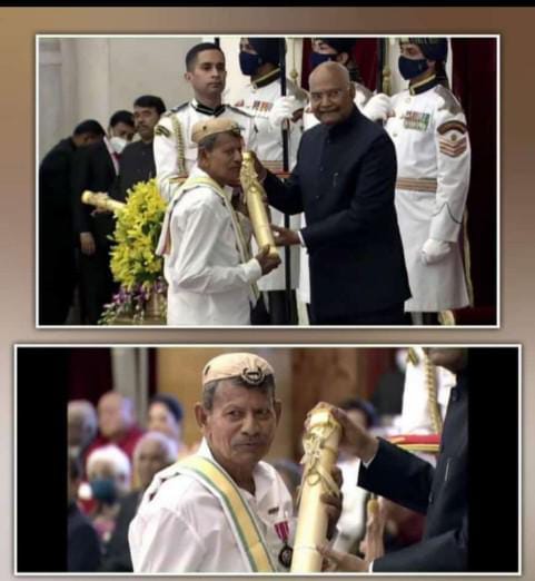 ದೇಶದ ಅತ್ಯುನ್ನತ ಗೌರವ ಪದ್ಮಶ್ರೀ ಪ್ರಶಸ್ತಿ ಪುರಸ್ಕೃತ ದ.ಕ.ದ ಅಮೈ ಮಹಾಲಿಂಗ ನಾಯ್ಕ ಅವರು ಮುಟ್ಟಾಳೆ ಧರಿಸಿ ಪ್ರಶಸ್ತಿ ಸ್ವೀಕರಿಸಿದರು.