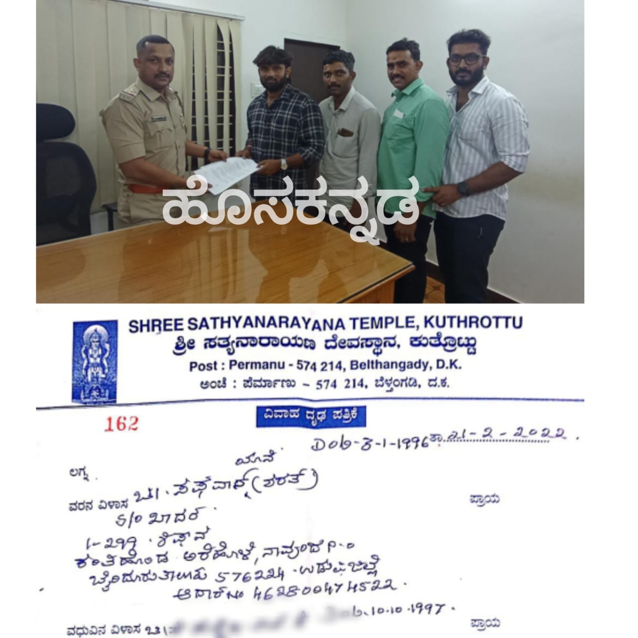 ಬೆಳ್ತಂಗಡಿ: ಇಲ್ಲಿನ ನಡ ಗ್ರಾಮದ ಕುತ್ರೊಟ್ಟು ಎಂಬಲ್ಲಿನ ಸತ್ಯನಾರಾಯಣ ದೇವಾಲಯದಲ್ಲಿ ಸ್ಥಳೀಯ ಹಿಂದೂ ಯುವತಿಯೊಬ್ಬಳ ವಿವಾಹವು ಉಡುಪಿ ಜಿಲ್ಲೆಯ ಮುಸ್ಲಿಂ ಯುವಕನೊಂದಿಗೆ ನಡೆದ ಬಗ್ಗೆ ವರದಿಯಾಗಿದ್ದು, ತಡವಾಗಿ ಬೆಳಕಿಗೆ ಬಂದ ವಿಷಯ ತಿಳಿದ ಕೂಡಲೇ ಹಿಂದೂ ಸಂಘಟನೆಗಳು ಘಟನೆಯ ಬಗ್ಗೆ ಕಿಡಿಕಾರಿದೆ. ಅಲ್ಲದೇ ಅನ್ಯ ಕೋಮಿನ ವಿವಾಹ ಮಾಡಿಸಿ ಸಾಮರಸ್ಯಕ್ಕೆ ಧಕ್ಕೆ ತಂದ ಬಗ್ಗೆ ನಗರ ಠಾಣೆಯಲ್ಲಿ ರಾಷ್ಟ್ರೀಯ ಹಿಂದೂ ಜಾಗರಣ ವೇದಿಕೆ ಪ್ರಕರಣವನ್ನು ದಾಖಲಿಸಿದೆ.