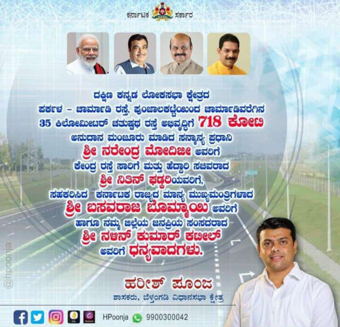 ಈ ಕಾರ್ಯಕ್ಕೆ ಪ್ರಧಾನಿಮಂತ್ರಿ ಶ್ರೀ ನರೇಂದ್ರ ಮೋದಿಯವರಿಗೆ, ಕೇಂದ್ರ ರಸ್ತೆ ಸಾರಿಗೆ ಮತ್ತು ಹೆದ್ದಾರಿ ಸಚಿವರಾದ ಶ್ರೀ ನಿತಿನ್ ಗಡ್ಕರಿ, ಕರ್ನಾಟಕ ರಾಜ್ಯ ಮುಖ್ಯಮಂತ್ರಿ ಶ್ರೀ ಬಸವರಾಜ್ ಬೊಮ್ಮಯಿ ,ಜಿಲ್ಲೆಯ ಸಂಸದರಾದ ಶ್ರೀ ನಳಿನ್ ಕುಮಾರ್ ಕಟೀಲ್ ಅವರಿಗೆ ಬೆಳ್ತಂಗಡಿ ಶಾಸಕರಾದ ಹರೀಶ್ ಪೂಂಜರವರು ಧನ್ಯವಾದವನ್ನು ತಿಳಿಸಿದ್ದಾರೆ.
