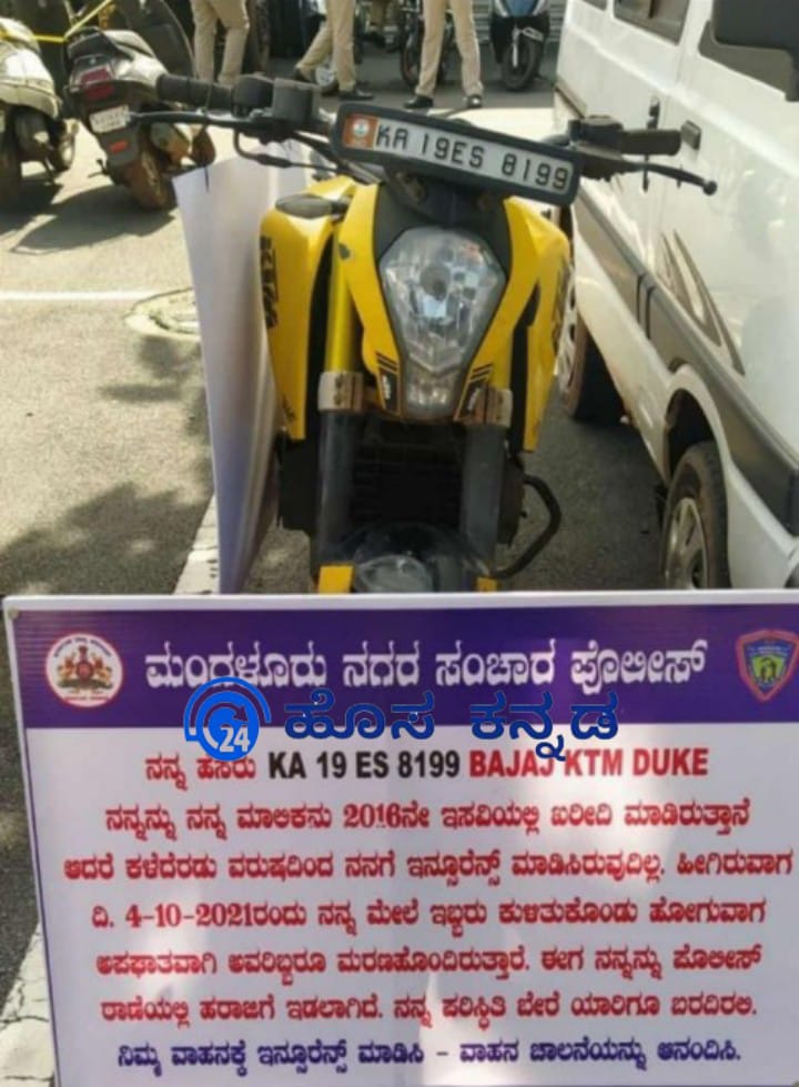 ಮಂಗಳೂರು : “ನನ್ನ ಹೆಸರು ಬಜಾಜ್ ಕೆಟಿಎಂ ಡ್ಯೂಕ್. 2016ರಲ್ಲಿ ನನ್ನ ಮಾಲಕ ನನ್ನನ್ನು ಖರೀದಿಸಿದ್ದ. ಆದರೆ ಕಳೆದೆರಡು ವರ್ಷಗಳಿಂದ ನನಗೆ ಇನ್ಶೂರೆನ್ಸ್ ಮಾಡಿಸಿರಲಿಲ್ಲ. ಹೀಗಿರುವಾಗ 4-10-2021ರಂದು ನನ್ನ ಮೇಲೆ ಇಬ್ಬರು ಕುಳಿತುಕೊಂಡು ಹೋಗುವಾಗ ಅಪಘಾತವಾಗಿ ಅವರಿಬ್ಬರೂ ಮರಣ ಹೊಂದಿರುತ್ತಾರೆ. ಈಗ ನನ್ನನ್ನು ಪೊಲೀಸ್ ಠಾಣೆಯಲ್ಲಿ ಹರಾಜಿಗೆ ಇಡಲಾಗಿದೆ. ನನ್ನ ಪರಿಸ್ಥಿತಿ ಬೇರೆ ಯಾರಿಗೂ ಬರದಿರಲಿ”.