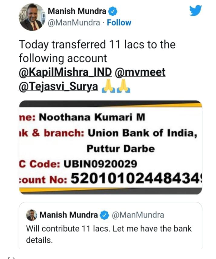 ಬಾಲಿವುಡ್ ನಿರ್ಮಾಪಕ ಹಾಗೂ ಉದ್ಯಮಿ ಆಗಿರುವ ಮನೀಶ್ ಮುಂದ್ರಾ, ಪ್ರವೀಣ್ ಕುಟುಂಬದ ಬ್ಯಾಂಕ್ ಖಾತೆಯ ಮಾಹಿತಿ ಪಡೆದು, ರೂ.11 ಲಕ್ಷ ಮೊತ್ತವನ್ನು ಪ್ರವೀಣ್ ಅವರ ಹೆಂಡತಿಯ ಬ್ಯಾಂಕ್ ಖಾತೆಗೆ ವರ್ಗಾಯಿಸಿರುವುದಾಗಿ ಟ್ವೀಟ್ ಮಾಡಿದ್ದಾರೆ.