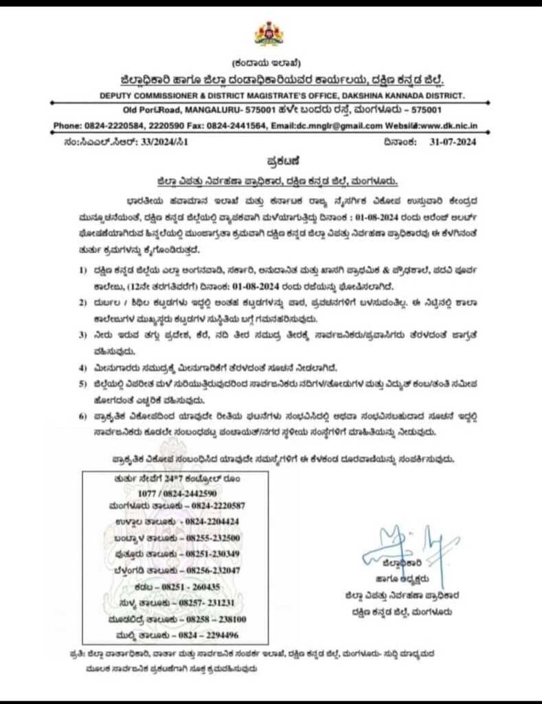 School Holiday: ಕರಾವಳಿ ಜಿಲ್ಲೆಯಾದ್ಯಂತ ನಿರಂತರವಾಗಿ ಎಡೆಬಿಡದೆ ಮಳೆ ಸುರಿಯುತ್ತಿರುವ ಹಿನ್ನೆಲೆಯಲ್ಲಿ ಮುಂಜಾಗ್ರತಾ ಕ್ರಮವಾಗಿ ನಾಳೆ (ಆಗಸ್ಟ್.1) ದ.ಕ ಜಿಲ್ಲೆಯಾದ್ಯಂತ ಎಲ್ಲಾ ಅಂಗನವಾಡಿ, ಪ್ರಾಥಮಿಕ ಮತ್ತು ಪ್ರೌಢಶಾಲೆಗಳಿಗೆ ಹಾಗೂ ಪದವಿಪೂರ್ವ ಕಾಲೇಜುಗಳಿಗೆ ಜಿಲ್ಲಾಧಿಕಾರಿ ಮುಲ್ಲೈ ಮುಗಿಲನ್ ಅವರು ರಜೆ ಘೋಷಿಸಿದ್ದಾರೆ.