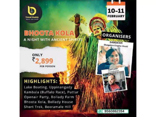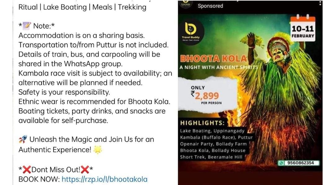 2024ರ ಫೆ.10 ಮತ್ತು 11ರಂದು ಈ ಪ್ಯಾಕೇಜ್ಗೆ ದಿನವನ್ನು ಘೋಷಣೆ ಮಾಡಿ ಟ್ರಾವೆಲ್ ಸಂಸ್ಥೆಯೊಂದು ದೈವಾರಾಧನೆಯ ಚಿತ್ರವೊಂದನ್ನು ಹಾಕಿ ಒಬ್ಬ ವ್ಯಕ್ತಿಗೆ 2899ರೂ. ಮೌಲ್ಯದ ಪ್ಯಾಕೇಜ್ವೊಂದನ್ನು ಘೋಷಣೆ ಮಾಡಿದೆ. ಪ್ಯಾಕೇಜ್ನಲ್ಲಿ ನದಿಯಲ್ಲಿ ಬೋಟಿಂಗ್, ಉಪ್ಪಿನಂಗಡಿ ಕಂಬಳ ವೀಕ್ಷಣೆ, ಬೊಳ್ಳಾಡಿ ಫಾರ್ಮ್ನನಲ್ಲಿ ಪಾರ್ಟಿ, ಬೊಳ್ಳಾಡಿ ಮನೆಯಲ್ಲಿ ಭೂತ ಕೋಲ, ಬೀರಮಲೆ ಬೆಟ್ಟಕ್ಕೆ ಟ್ರೆಕ್ಕಿಂಗ್ ಪ್ರವಾಸ ಎಂದು ನಮೂದಿಸಲಾಗಿದೆ.
