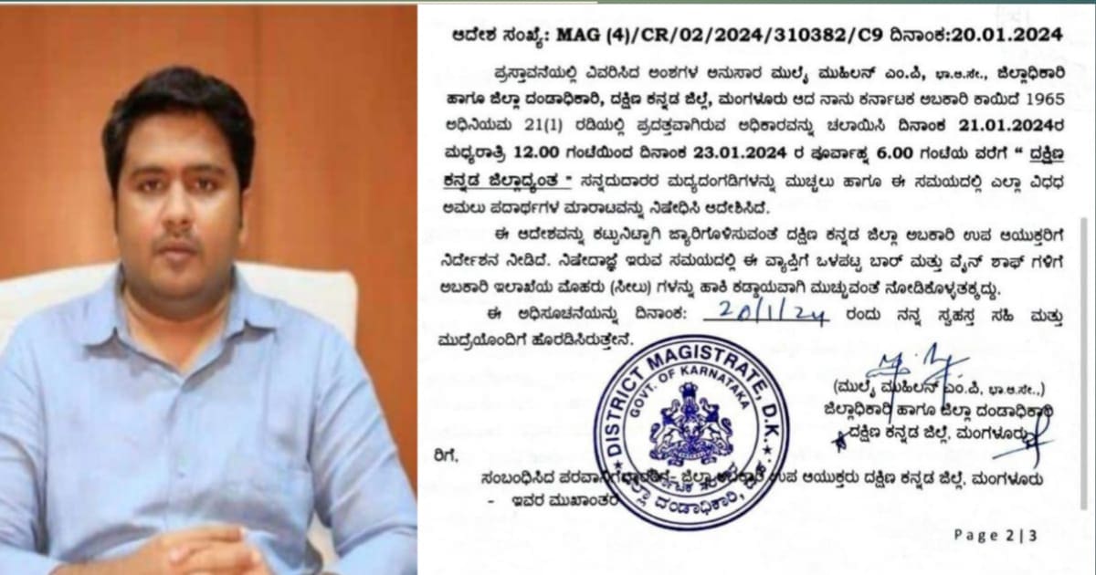 Mangaluru: ದಕ್ಷಿಣ ಕನ್ನಡ ಜಿಲ್ಲೆಯಾದ್ಯಂತ ಜ.21 ಮಧ್ಯರಾತ್ರಿಯಿಂದ ಜ.23 ರ ಮುಂಜಾನೆಯವರೆಗೆ ಮದ್ಯದಂಗಡಿಗಳನ್ನು ಮುಚ್ಚುವಂತೆ ಜಿಲ್ಲಾಧಿಕಾರಿ ಮುಲೈ ಮುಹಿಲನ್ ಆದೇಶ ಹೊರಡಿಸಿದ್ದಾರೆ.