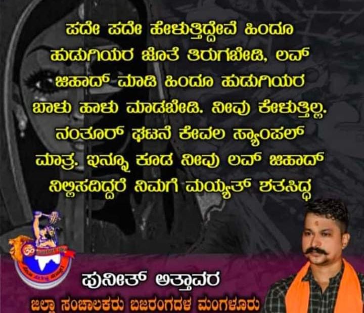 ಇನ್ನೂ ಪದೇ ಪದೇ ಹೇಳುತ್ತಿದ್ದೇವೆ ಹಿಂದು ಹುಡುಗಿಯರ ಜೊತೆ ತಿರುಗೇಡಿ ʻಲವ್‌ ಜಿಹಾದ್‌ʼ ಮಾಡಿ ಹಿಂದೂ ಹುಡುಗಿಯರ ಬಾಳು ಹಾಳು ಮಾಡಬೇಡಿ. ನೀವು ಕೇಳುತ್ತಿಲ್ಲ ನಂತೂರು ಘಟನೆ ಕೇವಲ ಸ್ಯಾಂಪಲ್‌ ಮಾತ್ರ ಇನ್ನೂ ಕೂಡ ನೀವು ಲಬ್‌ ಜಿಹಾದ್‌ ನಿಲ್ಲಿಸದಿದ್ದರೆ ನಿಮಗೆ ಮಯ್ಯತ್‌ ಶತಸಿದ್ಧ ಎಂದು  ಪುನೀತ್‌ ಅತ್ತಾವರ್‌ ಪೋಸ್ಟರ್‌ ಹಂಚಿಕೊಂಡಿದ್ದಾರೆ. ಇದೀಗ ಮತ್ತೊಂದು ಧರ್ಮ ದಂಗಲ್‌ಗೆ ಕಾರಣವಾಗಿದಂತೂ ನಿಜ