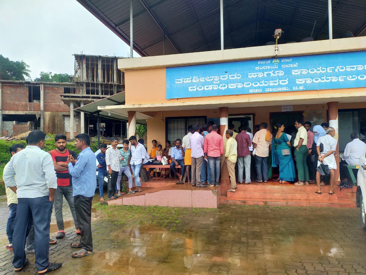 ಒಂದೆಡೆ ಮಳೆ, ಇನ್ನೊಂದೆಡೆ ಕಛೇರಿಯ ಎದುರು ಪುರುಷರು, ಮಹಿಳೆಯರು ಅರ್ಜಿ ಹಿಡಿದುಕೊಂಡು ನಿಂತು ಬಿಟ್ಟಿದ್ದಾರೆ.