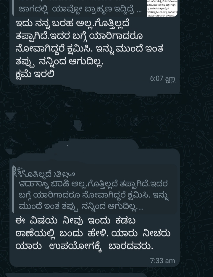 ಈ ವಿಚಾರ ಗ್ರೂಪಿನಲ್ಲಿರುವ ದಲಿತ ಮುಂದಾಳುಗಳ ಗಮನಕ್ಕೆ ಬಂದಿದ್ದು, ಕೂಡಲೇ ವಿಚಾರ ಅಡ್ಮಿನ್ ಗಮನಕ್ಕೂ ಬಂದಿತ್ತು.