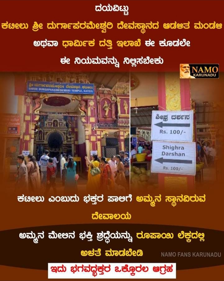 ಮಂಗಳೂರು: ಕರಾವಳಿ ಜಿಲ್ಲೆಯ ಸಹಿತ ಹೊರಜಿಲ್ಲೆಗಳಲ್ಲಿ ಒಂದೆರಡು ದಿನಗಳಿಂದ ಸಾಮಾಜಿಕ ಜಾಲತಾಣಗಳಲ್ಲಿ ಪೋಸ್ಟರ್ ಒಂದು ಹರಿದಾಡಿ ಭಾರೀ ಸುದ್ದಿಯಾಗುತ್ತಿದೆ. ‘ಅಮ್ಮನ ಮೇಲಿನ ಭಕ್ತಿಯನ್ನು ರೂಪಾಯಿ ಲೆಕ್ಕದಲ್ಲಿ ಅಳೆಯಬೇಡಿ’ ಎನ್ನುವ ಬರಹದ ಪೋಸ್ಟರ್ ಹರಿದಾಡಿದ್ದು, ಜೊತೆಗೆ ಕಟೀಲು ಕ್ಷೇತ್ರದ ಫೋಟೋ ಸಹಿತ ಬರಹಗಳು ಕಂಡುಬಂದಿದೆ.