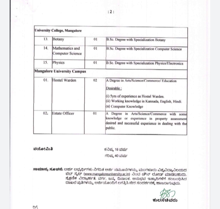 ಮಂಗಳೂರು ವಿಶ್ವವಿದ್ಯಾನಿಲಯದಲ್ಲಿ ವಿವಿಧ ಹುದ್ದೆಗಳ ಭರ್ತಿಗೆ ನೇರ ಸಂದರ್ಶನಕ್ಕೆ ಆಹ್ವಾನಿಸಲಾಗಿದೆ. ಹುದ್ದೆಗಳ ಬಗೆಗಿನ ಹೆಚ್ಚಿನ ವಿವರಗಳನ್ನು ಈ ಕೆಳಗೆ ನೀಡಲಾಗಿದೆ. ಆಸಕ್ತರು ನೇರ ಸಂದರ್ಶನದಲ್ಲಿ ಭಾಗವಹಿಸಬಹುದು.