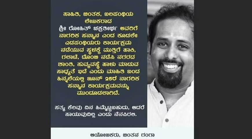 ಮಂಗಳೂರಿನಲ್ಲಿ ಇಂದು ಆಯೋಜಿಸಲಾಗಿದ್ದ ಪಠ್ಯ ಪುಸ್ತಕ ಪರಿಷ್ಕರಣೆ ಸಮಿತಿ ಅಧ್ಯಕ್ಷರಾಗಿದ್ದ ರೋಹಿತ್ ಚಕ್ರತೀರ್ಥ ಸನ್ಮಾನ ಕಾರ್ಯಕ್ರಮವನ್ನು ವ್ಯಾಪಕ ವಿರೋಧದ ಹಿನ್ನೆಲೆಯಲ್ಲಿ ತಾತ್ಕಾಲಿಕವಾಗಿ ಮುಂದೂಡಲಾಗಿದೆ.