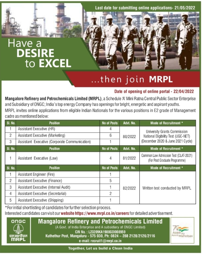 ಮಂಗಳೂರು ರಿಫೈನರಿ ಮತ್ತು ಪೆಟ್ರೋಕೆಮಿಕಲ್ಸ್ ಲಿಮಿಟೆಡ್ ( ಎಂಆರ್ ಪಿಎಲ್) ಅಧಿಕೃತ ಅಧಿಸೂಚನೆಯ ಮೂಲಕ ಸಹಾಯಕ ಕಾರ್ಯನಿರ್ವಾಹಕ, ಸಹಾಯಕ ಎಂಜಿನಿಯರ್ ಹುದ್ದೆಗಳನ್ನು ಭರ್ತಿ ಮಾಡಲು ಅರ್ಹ ಮತ್ತು ಆಸಕ್ತ ಅಭ್ಯರ್ಥಿಗಳಿಂದ ಅರ್ಜಿಗಳನ್ನು ಆಹ್ವಾನಿಸಿದೆ.