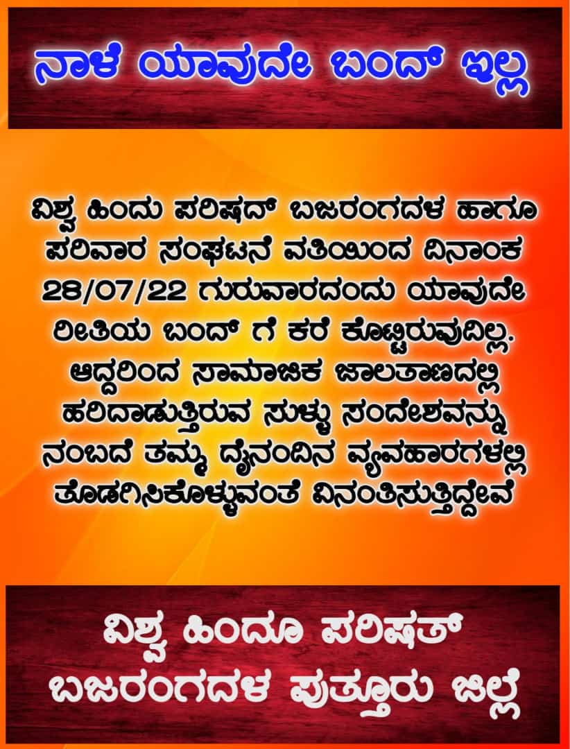 “ನಾಳೆ 28/07/2022 (ಗುರುವಾರ)ದಂದು ದಕ್ಷಿಣ ಕನ್ನಡ ಜಿಲ್ಲೆಯಲ್ಲಿ ಸ್ವಯಂ ಬಂದ್ಗೆ ಕರೆ ನೀಡಿದೆ. ಸಮಸ್ತ ಶಾಲೆ ಕಾಲೇಜು ಹೋಟೆಲ್ ಅಂಗಡಿ ಗೂಡಂಗಡಿ ಬಂದ್ ಮಾಡಲು ಕರೆ ನೀಡಲಾಗಿದ್ದು, ವಾಹನಸವಾರರು ಕೂಡ ಬಂದ್ ಗೆ ಸಮೇತವಾಗಿ ಸ್ವಯಂ ಪ್ರೇರಿತರಾಗಿ ಬಂದ ಮಾಡಲು ಮನವಿ ಮಾಡಲಾಗಿದೆ” ಎಂಬ ಮಾಹಿತಿಯೂ ಸಾಮಾಜಿಕ ಜಾಲತಾಣದಲ್ಲಿ ಹರಿದಾಡುತ್ತಿದ್ದೆ.