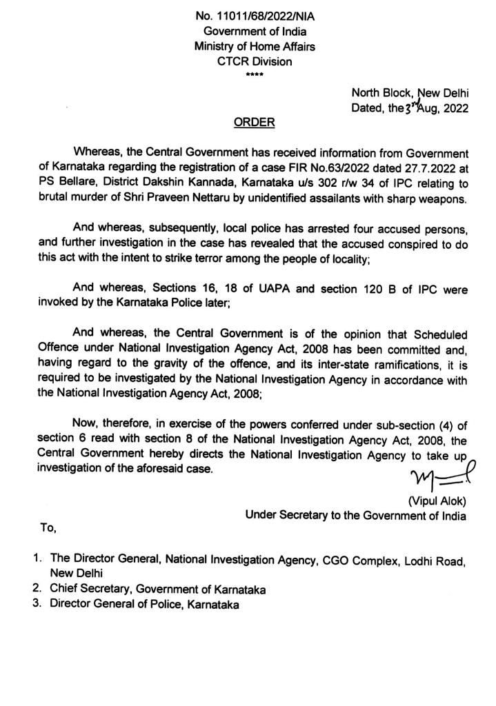 ಭಾರತ ಸರ್ಕಾರದ ಅಧೀನ ಕಾರ್ಯದರ್ಶಿ ವಿಪುಲ್ ಅಲೋಕ್ ಅ .3 ರಂದು ಈ ಬಗ್ಗೆ ರಾಷ್ಟ್ರೀಯ ತನಿಖಾ ಸಂಸ್ಥೆಯ ಮಹಾನಿರ್ದೇಶಕರಾಗಿ ಪತ್ರ ಬರೆದು ಆದೇಶಿಸಿದ್ದಾರೆ. ಭಾರತ ಸರಕಾರದ ಗೃಹ ಸಚಿವಾಲಯವು ಈ ಅದೇಶವನ್ನು ಹೊರಡಿಸಿದ್ದು, ಅದರ ಪ್ರತಿಯನ್ನು ಕರ್ನಾಟಕ ಸರಕಾರದ ಮುಖ್ಯ ಕಾರ್ಯದರ್ಶಿಗಳಿಗೆ ಹಾಗೂ ಡಿಜಿಪಿ ಕರ್ನಾಟಕ ಅವರಿಗೆ ಕಳುಹಿಸಿಕೊಟ್ಟಿದ್ದಾರೆ.