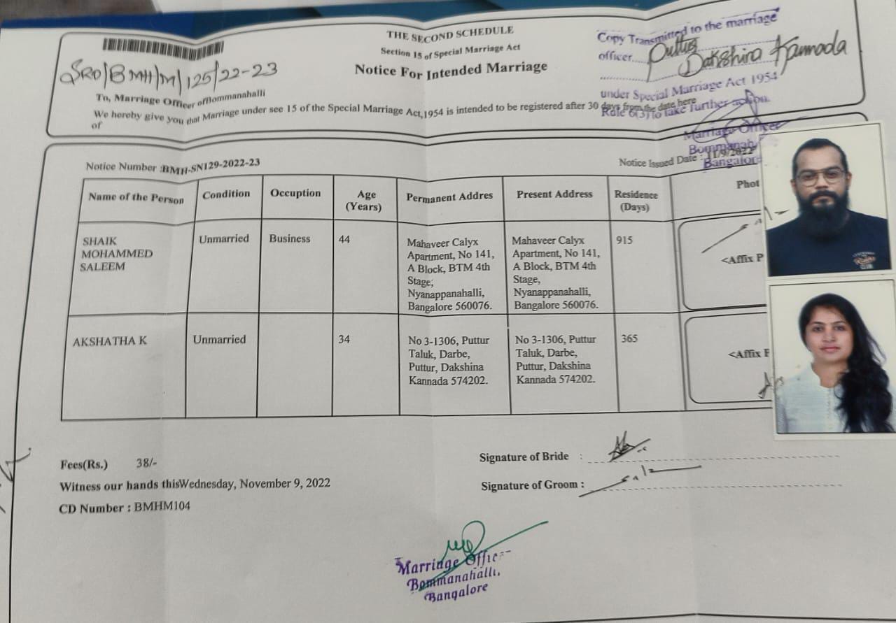 ಪುತ್ತೂರು ಮೂಲದವರಾಗಿದ್ದು ಇದೀಗ ಬೆಂಗಳೂರಿನಲ್ಲಿ ವಾಸ್ತವ್ಯ ಹೊಂದಿರುವ ಅಕ್ಷತಾ ಕೆ. ಅವರು ಬೆಂಗಳೂರಿನ ನ್ಯಾಪನಹಳ್ಳಿ ನಿವಾಸಿ ಶೇಖ್ ಮಹಮ್ಮದ್ ಸಲೀಮ್ ಅವರನ್ನು ವಿವಾಹ ಆಗುವುದಾಗಿ ಬೆಂಗಳೂರಿನ ವಿವಾಹ ನೋಂದಣಿ ಕಚೇರಿಯಲ್ಲಿ ಅರ್ಜಿ ಸಲ್ಲಿಸಿದ್ದಾರೆ.