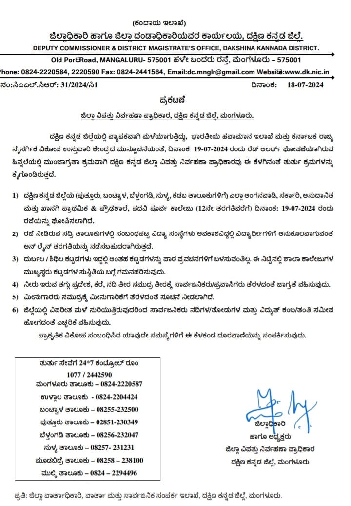 ದಕ್ಷಿಣ ಕನ್ನಡ ಜಿಲ್ಲೆಯಲ್ಲಿ ವ್ಯಾಪಕವಾಗಿ ಮಳೆಯಾಗುತ್ತಿದ್ದು, ಭಾರತೀಯ ಹವಾಮಾನ ಇಲಾಖೆ ಮತ್ತು ಕರ್ನಾಟಕ ರಾಜ್ಯ ನೈಸರ್ಗಿಕ ವಿಕೋಪ ಉಸ್ತುವಾರಿ ಕೇಂದ್ರದ ಮುನ್ಸೂಚನೆಯಂತೆ, ದಿನಾಂಕ 19-07-2024 ರಂದು ರೆಡ್ ಅಲರ್ಟ್ ಘೋಷಣೆಯಾಗಿರುವ ಹಿನ್ನಲೆಯಲ್ಲಿ ಮುಂಜಾಗ್ರತಾ ಕ್ರಮವಾಗಿ ದಕ್ಷಿಣ ಕನ್ನಡ ಜಿಲ್ಲಾ ವಿಪತ್ತು ನಿರ್ವಹಣಾ ಪ್ರಾಧಿಕಾರವು ಈ ಕೆಳಗಿನಂತೆ ತುರ್ತು ಕ್ರಮಗಳನ್ನು ಕೈಗೊಂಡಿರುತ್ತದೆ.