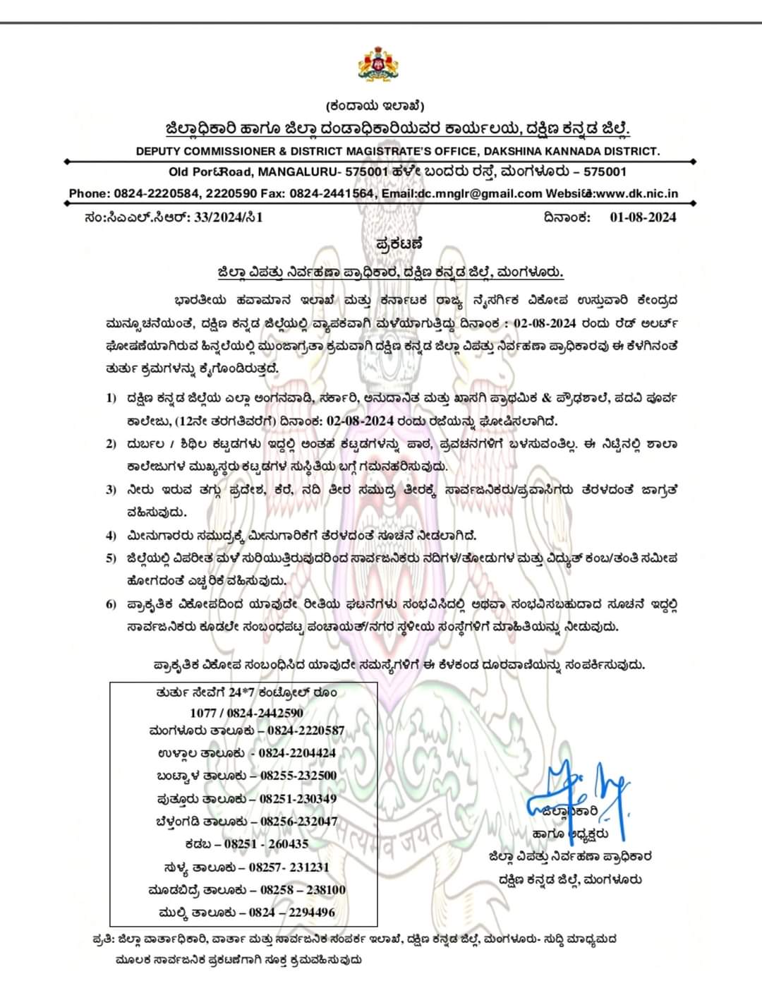 ನಾಳೆ ದಕ್ಷಿಣ ಕನ್ನಡದ ಎಲ್ಲಾ ಶಾಲಾ ಗಳಿಗೆ ರಜೆ ಘೋಷಣೆ ಮಾಡಿದ್ದಾರೆ. ಹೆಚ್ಚಿನ ವಿವರಗಳಿಗಾಗಿ ಕೆಳಗಿನ ನೋಟಿಫಿಕೇಶನ್ ನೋಡಿ.