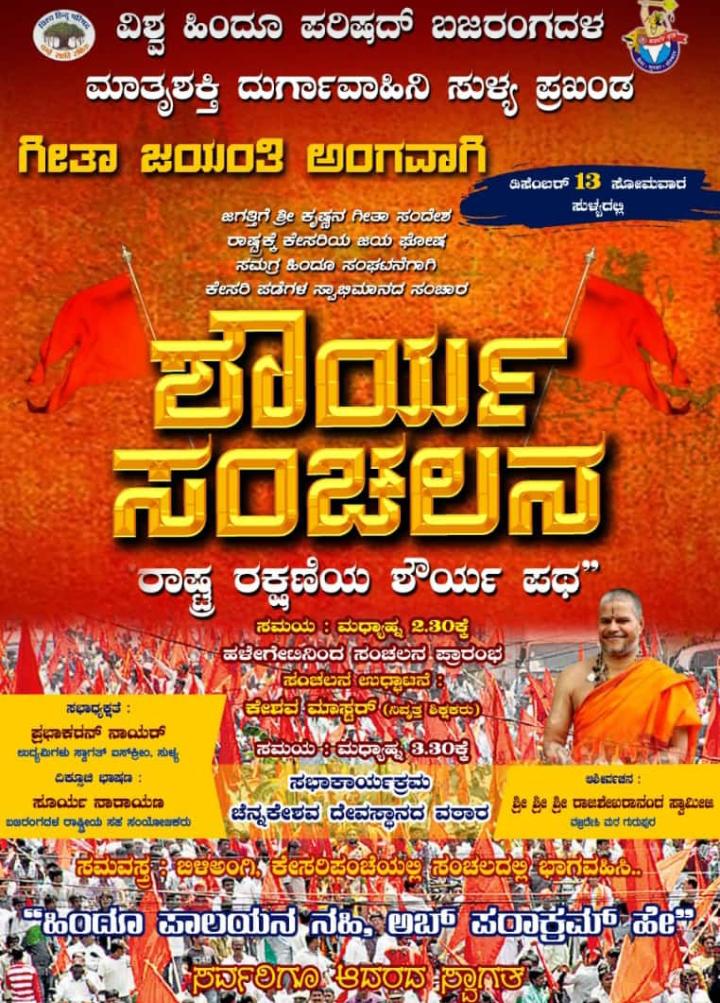 ಎತ್ತ ನೋಡಿದರೂ ಕೇಸರಿಮಯ. ಕೇಸರಿ ಬಾವುಟ, ಶಾಲು, ಸಾವಿರಾರು ಸಂಖ್ಯೆಯ ಹಿಂದೂ ಕಾರ್ಯಕರ್ತರು. ಇದೆಲ್ಲಾ ಕಂಡುಬಂದದ್ದು ದಕ್ಷಿಣ ಕನ್ನಡ ಜಿಲ್ಲೆಯ ಹಿಂದೂ ಭದ್ರಕೋಟೆ ಸುಳ್ಯ ದಲ್ಲಿ.ವಿಶ್ವ ಹಿಂದೂ ಪರಿಷತ್ ಭಜರಂಗದಳ ಸುಳ್ಯ ಪ್ರಖಂಡ ವತಿಯಿಂದ ನಡೆದ ಹಿಂದೂ ಶೌರ್ಯ ಸಂಚಲನ ಕಾರ್ಯಕ್ರಮದಲ್ಲಿ.