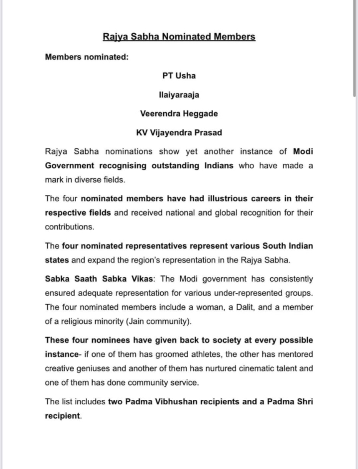 ಸಂಗೀತ ನಿರ್ದೇಶಕ ಇಳೆಯರಾಜ, ಓಟದ ರಾಣಿ ಪಿಟಿ ಉಷಾ ಮತ್ತು ವಿಜಯೇಂದ್ರ ಪ್ರಸಾದ್ ಅವರು ರಾಜ್ಯಸಭೆಗೆ ನಾಮನಿರ್ದೇಶನಗೊಂಡ ಇತರರು.